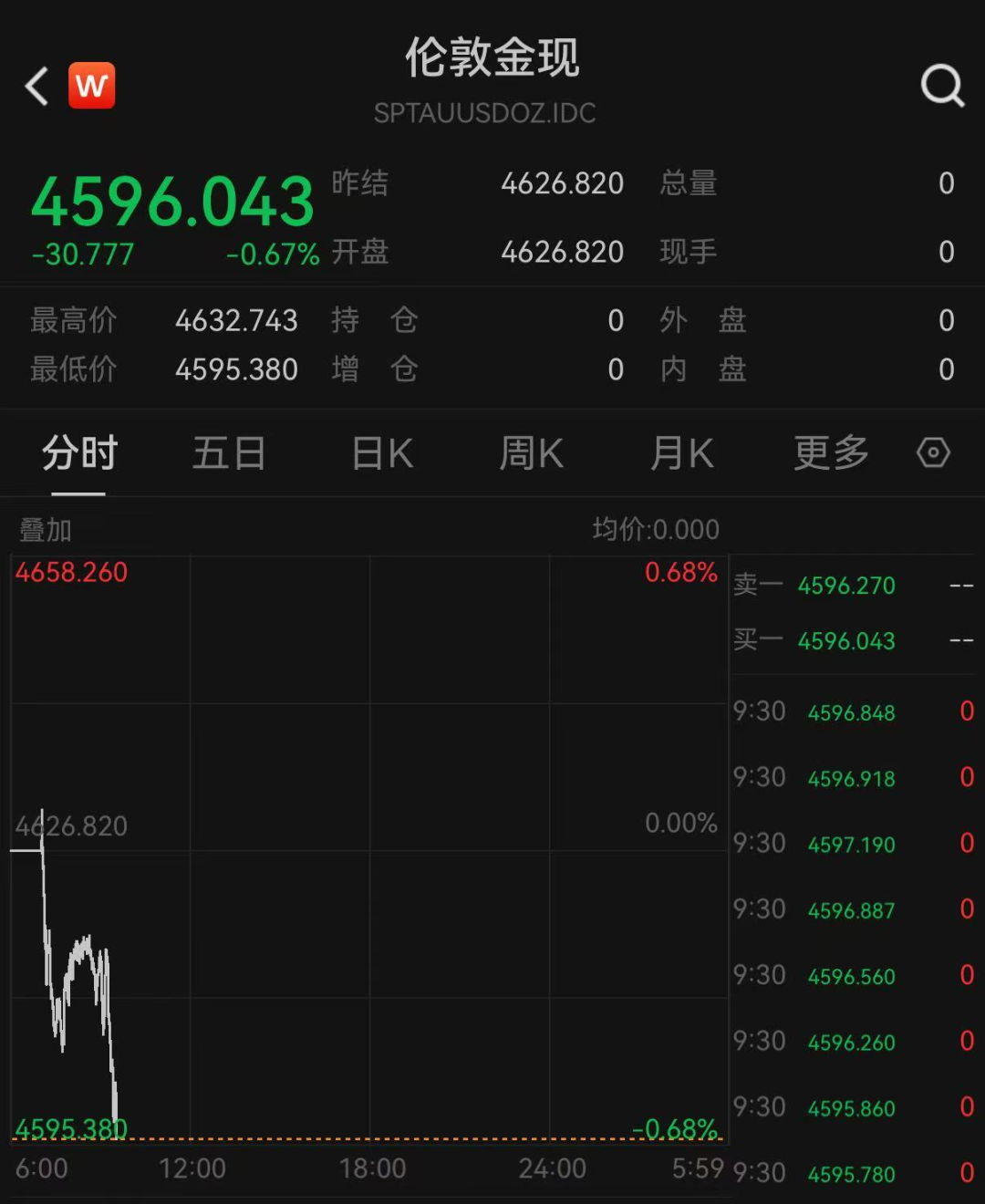 15日早盘,现货黄金(伦敦金现)持续下挫,向下跌破4600美元/盎司。截至发稿,报4596.043美元/盎司,跌0.67%。