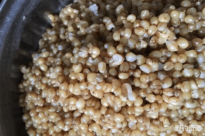 拿高压锅把麦粒煮到刚着花(顾惜,是刚着花不是煮烂!),捞出来沥干,趁温乎的时候拌上蜂蜜水(蜂蜜:温水=1:3),密封发酵两三天。这时候的麦粒,软硬适中,甜香四溢,草鱼鲤鱼闻见就走不动说念!
