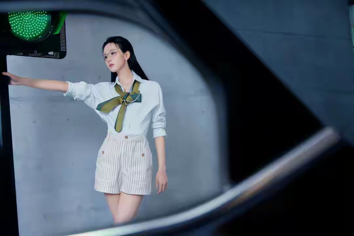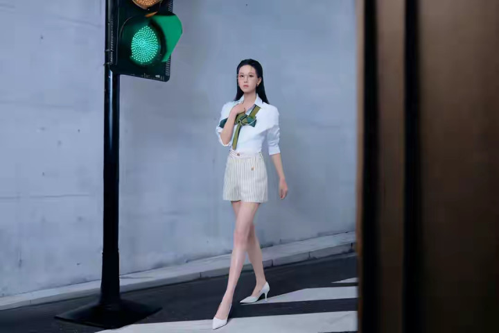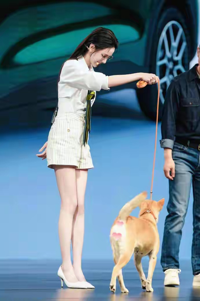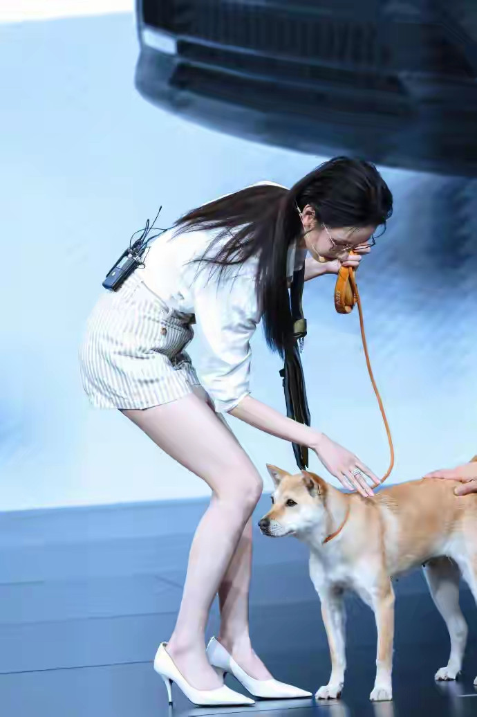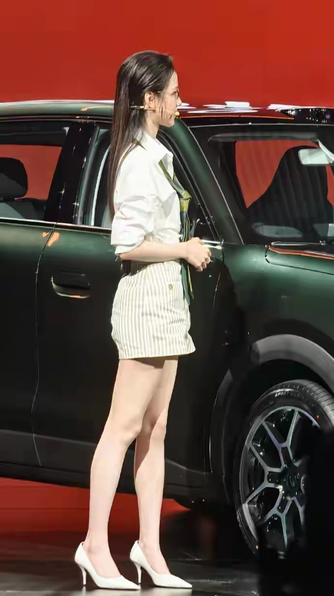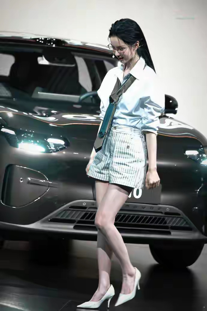 开云 陈皆灵零跑发布会出图, 职场女性白衬衫条纹短裙细高跟筷子腿
