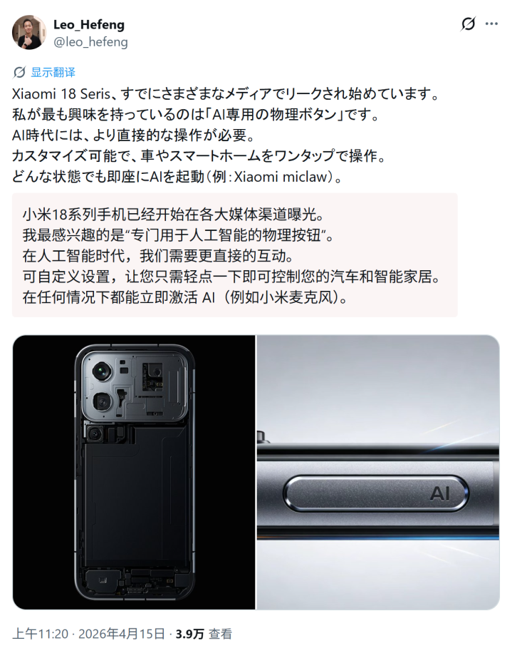 音讯源@leo_hefeng4月15日在X平台发布推文,分享了一组渲染图,展示了小米18Pro手机,要点突显机身侧面的AI按键,维持启动AI功能、湮灭智能家居及小米汽车。