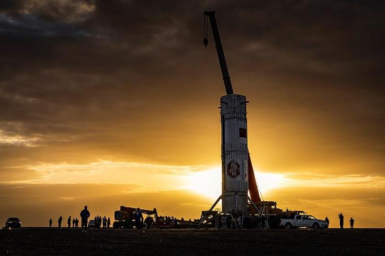 2024年9月,甘肃酒泉,矗立在着陆场上的蓝箭航天朱雀三号VTVL-1垂直起降试验箭,工作人员在周围开展试验后处理工作。