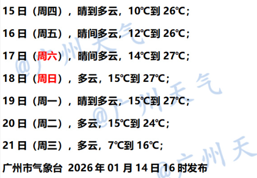 1月16日,肇庆、清远、韶关和南部沿海市县多云间阴天,其余大部市县晴天间多云。西江流域、珠三角南部沿海和雷州半岛早晚有(轻)雾。最低气温:粤北市县9~11℃,珠三角南部沿海市县和雷州半岛15~18℃,其余市县12~14℃。