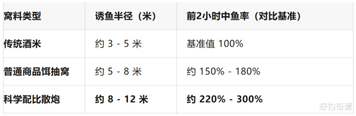 不同窝料在单元工夫内(前2小时)的诱鱼领域与中鱼率对比(模拟数据):
