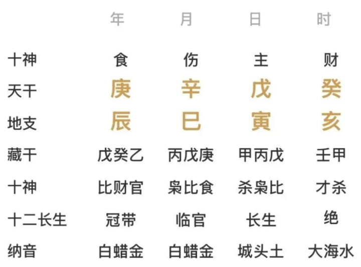 乾造:庚辰年,辛巳月,戊寅日,癸亥时(申酉空)