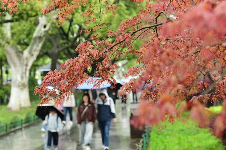 4月3日,杭州市民冒雨出行。里尔摄