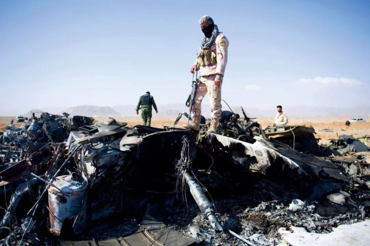 4月6日,伊朗伊斯法罕,伊朗士兵站在好意思军坠毁飞机的残破上。本文图/视觉中国