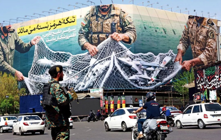 4月5日,伊朗德黑兰一处广场上,巨型海报配有“霍尔木兹海峡将保持关闭”的字样。