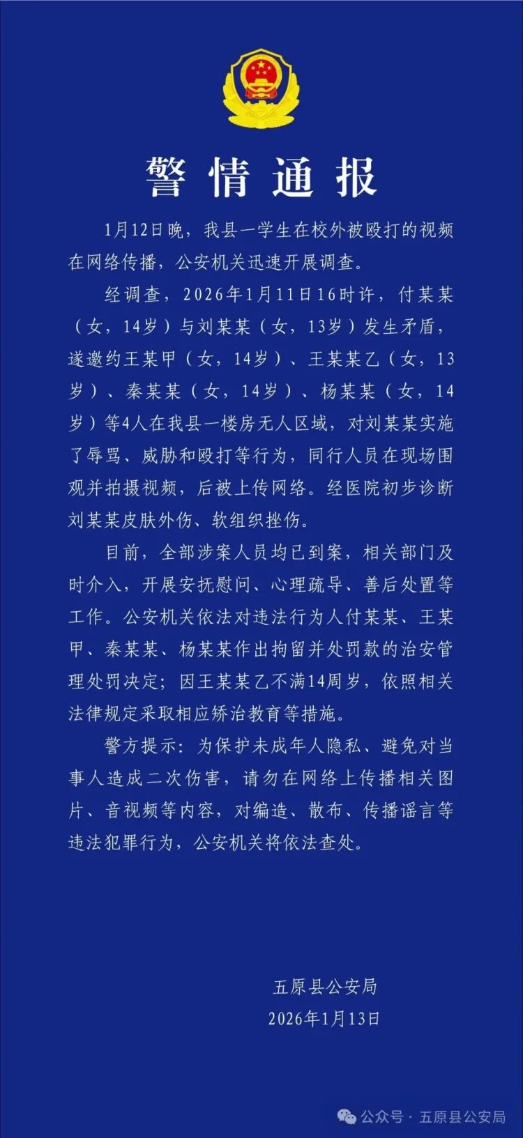 2026年1月13日,内蒙古五原县公安局发布一则警情通报: