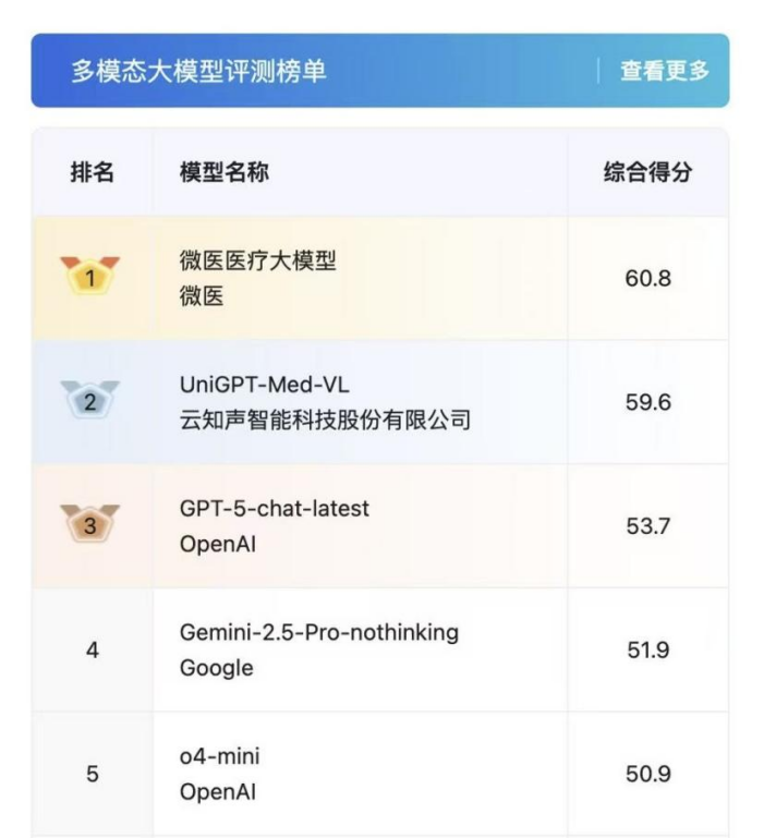 在至关重要的多模态能力上,微医医疗大模型问鼎评测榜单。MedBench 4.0瞄准医疗影像、检测报告等临床核心场景,设置了涵盖目标检测、图像分类、多模态报告质控、序列影像理解、病程动态追踪等10项细分任务。这填补了中文医疗多模态评测领域的技术缺口,也为微医医疗大模型在医学影像辅助分析、多模态报告解读等方面的能力提供了精准的验证依据。在针对大语言模型和智能体的评测方面,微医医疗大模型均位列榜单前三,行业领先的医疗AI研发能力进一步凸显。