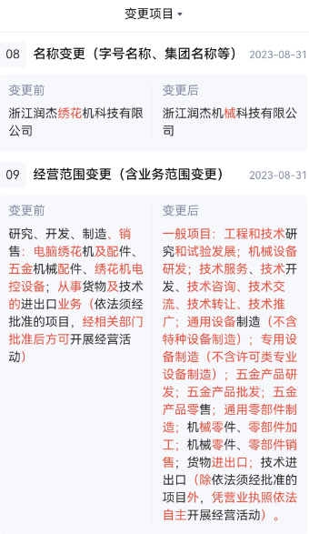 招股书披露,李建成在浙江润杰机械科技有限公司、诸暨市润杰文体有限公司均担任监事职务,浙江润杰机械科技有限公司除厂房出租外,无其他经营业务。而据《天眼查》显示,浙江润杰机械科技有限公司曾在2023年实施过工商变更,将公司名称从此前的“浙江润杰绣花机科技有限公司”变更为浙江润杰机械科技有限公司,主营业务也从“研究、开发、制造、销售电脑绣花机及配件”进行了修改。