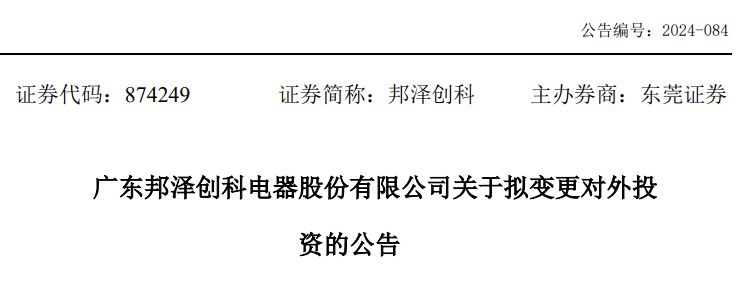 {jz:field.toptypename/}但据公司此前于2024年7月16日发布的《拟变更对外投资的公告》显示:公司与厚街镇政府拟就公司在东莞市投资邦泽创科电器制造总部基地项目开展合作,并拟签署《邦泽创科电器制造总部基地项目投资协议书》,经双方协商决定,拟就项目投资总额、用地位置、面积等内容的变更调整,同意将项目投资总额变更为62640万元,这与本次招股书披露的投资金额相差巨大。对此,公司并未接受记者采访。