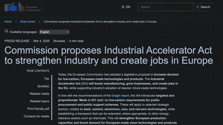 ▲欧盟委员会官网发布的《工业加快器法案》内容