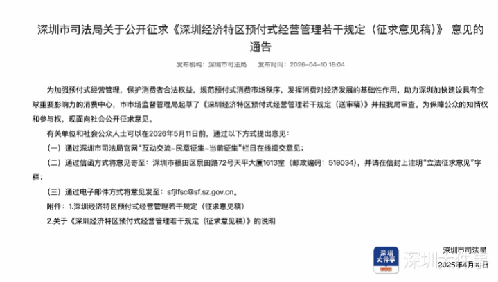 近日,深圳市功令局发布对于公开征求《深圳经济特区预支式谋略连接多少法例(征求倡导稿)》(以下简称《倡导稿》)倡导的文书。其中提到,为加强预支式谋略连接,保护耗尽者正当权益,治安预支式耗尽市集纪律,融会耗尽对经济发展的基础性作用,助力深圳加速诞生具有环球贫瘠影响力的耗尽中心,深圳市市集监督连接局草拟了《深圳经济特区预支式谋略连接多少法例(送审稿)》并报功令局审查,现面向社会公开征求倡导。
