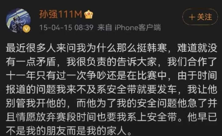 当初韩寒就消除了赛段时辰恭候御用领航员孙强系上安全带,后头两东说念主还因此有过争吵,只不外王人是为了互相破除。
